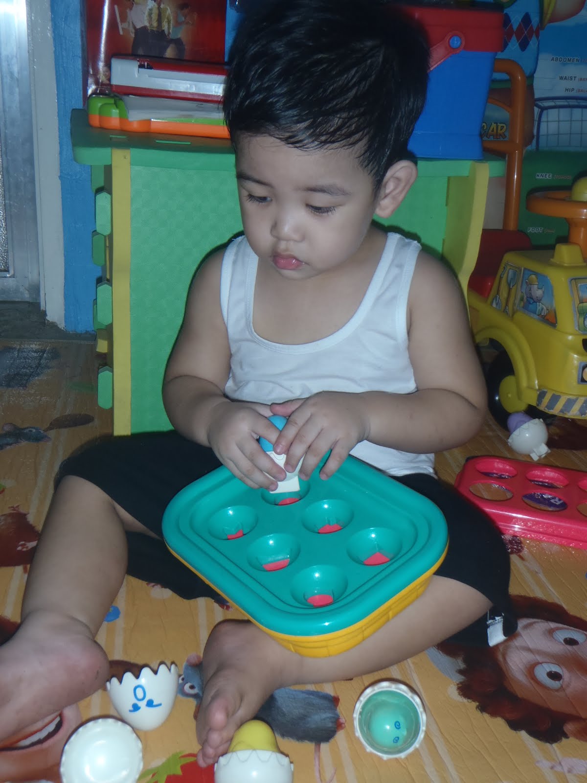 we received this, along with a tiger stuff toy + a tiger book, a few weeks back. it was a package sent by mum’s blogger friend, mommy joy (if you want to receive toys + books from her too, do head down to her blog to contact her). the instant i saw this toy, i wanted to play with it at once, but mum told me that she has to clean it first. the moment mum finished cleaning them, i played with these toys right away. they are a bunch of cracked eggs sitting atop holes that matches the egg bottoms. it is battery-operated although we have yet to see what it does, since mum wasn’t able to buy a new set of batteries for it yet. the eggs also have different expressions.